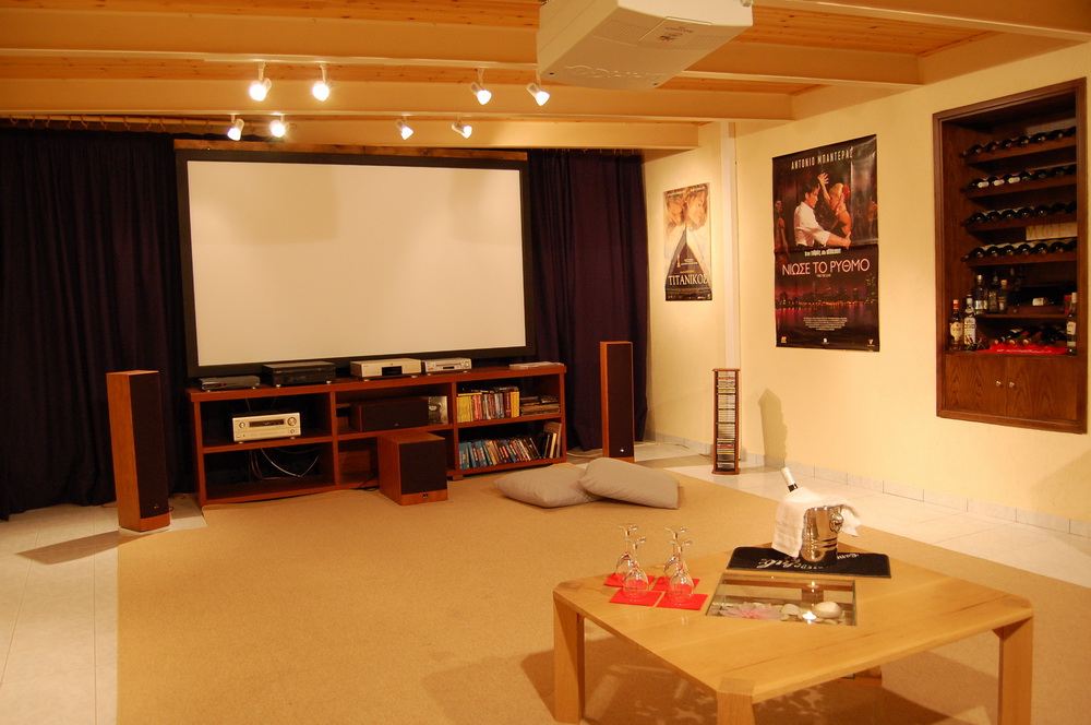 «Πρόκειται για έναν χώρο» μας είπε «που ήταν όνειρο πολλών ετών. Πραγματοποιήθηκε με μεράκι, πολύ δουλειά και αρκετά χρήματα. Αισθάνομαι όμως περήφανος για το τελικό αποτέλεσμα γιατί δημιουργήθηκε ένας χώρος private projections στον οποίο μπορεί να έρθει μια παρέα να χαλαρώσει και να απολαύσει την αγαπημένη της ταινία, να ακούσει τη μουσική που θέλει σε ολοκληρωμένα ηχητικά συστήματα, ανοίγοντας ένα μπουκάλι κρασί από τη συλλογή μας ή απλά πίνοντας έναν espresso. Φυσικά ο χώρος είναι διαθέσιμος για κάθε εκδήλωση που απαιτεί κορυφαία ποιότητα ήχου και εικόνας. Μπορεί να είναι ένα party ή οτιδήποτε άλλο. Έχει γίνει πρόβλεψη και υπάρχουν ακόμη και ειδικά φωτιστικά για αυτό. Και λίγα λόγια για το setup του συστήματος, καταρχήν είμαστε λάτρεις της αναλογικής εικόνας και όχι της ψηφιακής με ότι αυτό συνεπάγεται, ο προτζέκτορας λοιπόν είναι ένας BARCO crt τρίφακος 7/ιντσος, ο οποίος προβάλει σε μια οθόνη Euroscreen 120 ιντσών 16:9. Σαν πηγή σήματος δηλαδή το DVDp, χρησιμοποιούμε ένα Toshiba με component έξοδο, η καλωδίωση ανήκει στην monster cable, το τμήμα του ήχου το έχει αναλάβει ένας πολυκάναλος της Denon σε συνεργασία με ένα set ηχείων της JMlab Focal.»